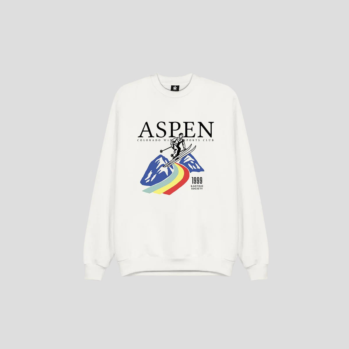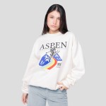 Ta bluza przyciąga uwagę od pierwszego spojrzenia. Głęboki kremowy odcień działa jak neutralna baza – subtelna, ale nie nudna. Główną rolę gra tutaj duża ilustracja na froncie: postać narciarza pędzącego przez górski krajobraz, z dynamiczną linią tęczowego śladu, który dodaje energii całej kompozycji. Ponad ilustracją widnieje napis ASPEN – Colorado Winter Sports Club, który natychmiast przenosi myślami do zasypanych śniegiem stoków, kubków gorącej czekolady i sportowego, oldschoolowego sznytu. To jak plakat z górskiego kurortu, tyle że... do noszenia.