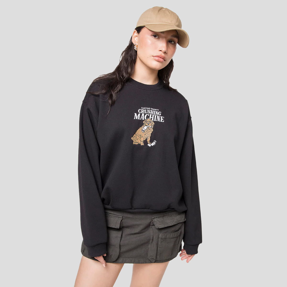 Bluza CREW CRUSHING MACHINE posiada duży nadruk na klatce piersiowej.
