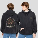 Bluza TRUST YOUR INTUITION posiada mały nadruk na klatce piersiowej i duży nadruk na plecach. Na całej powierzchni bluzy został naniesiony efekt acid wash.