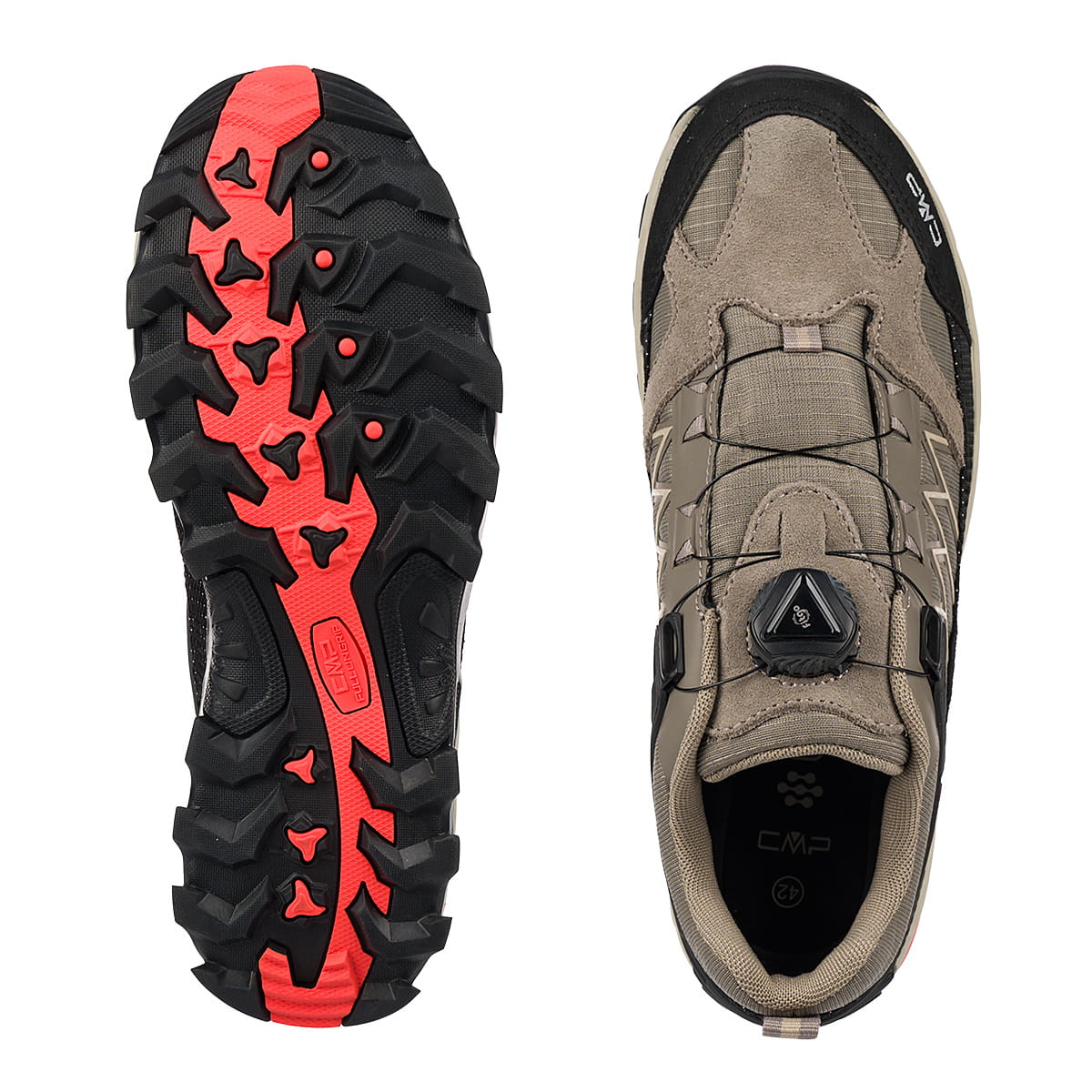 Podeszwa oparta o technologię CMP FULL On GRIP zapewni bezpieczeństwo i pewny krok użytkownika w niemal każdych warunkach pogodowych. Stosując agresywny wzór bieżnika, sprawdzi się zarówno na suchych, jak i mokrych nawierzchniach, przy zachowaniu niskiego poziomu ścieralności.