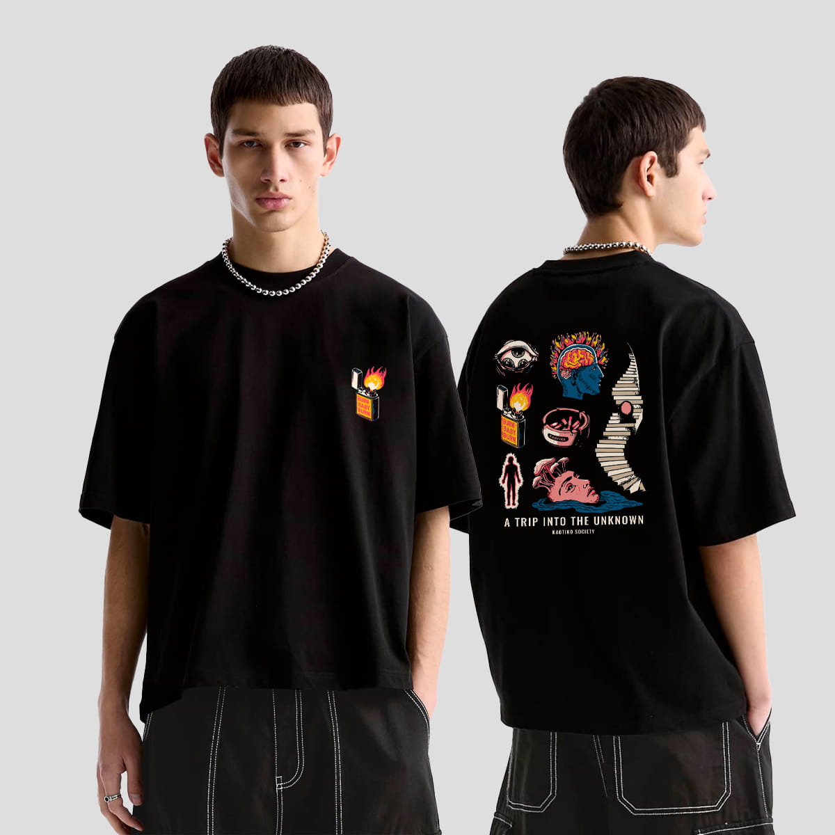 Centralnym punktem koszulki jest hipnotyzujący nadruk, który łączy elementy psychodelii, sci-fi i stylu lo-fi lat 90. Motyw „Unknown Trip” może być interpretowany jako sen, odlot lub symbol zmiany perspektywy. To wizualna przygoda dla oka – kalejdoskop emocji, przestrzeni i pomysłów, które zderzają się w jednym punkcie. Grafika nie tylko przyciąga wzrok – opowiada historię, której jesteś częścią. Albo dopiero się nią stajesz.